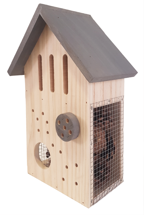 Abri en pin à fixer, pour l'accueil des papillons, coccinelles, chrysopes, syrphes et perce-oreilles.