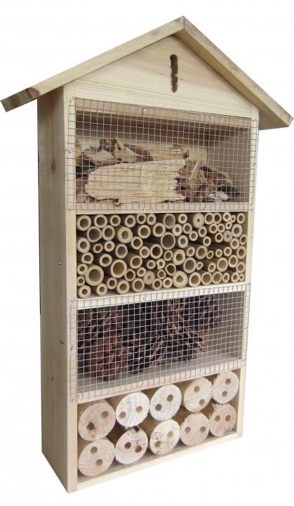 ABRI pour insectes auxiliaires en pin certifié FSC. Favorise la pollinisation. L'hôtel à insectes permet d'abriter bon nombre d'auxiliaires du jardin et de favoriser ainsi la pollinisation des plantes et la lutte biologique contre les insectes ravageurs (pucerons, chenilles…).