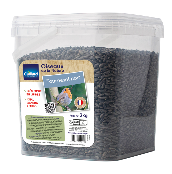 Le Tournesol noir est la graine de tournesol la plus riche en matières grasses ! Elle est très appréciée par les mésanges, les chardonnerets, les moineaux... durant la période hivernale. Les graines peuvent être disposées dans des mangoires mais aussi directement au sol pour certaines espèces, comme le pinson ou le rouge-gorge.