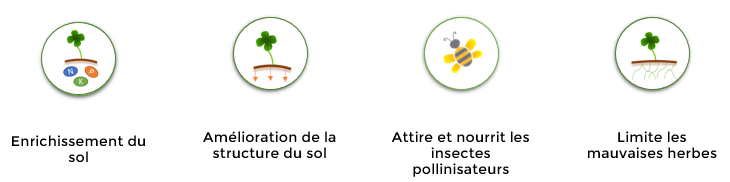 Légumineuse vivace, elle offre une excellente résistance au froid et au piétinement, un bon apport durable en azote pour les sols (jusqu'à 3 ans de fertilisation !), ainsi qu'un apport en protéines intéressant pour l'usage en fourragère pour les lapins, moutons et volailles. Son enracinement important restructure le sol, et ses fleurs mellifères colorées sont très attractives pour les insectes, notamment les pollinisateurs. Le trèfle craint les excès d'arrosage et les trop fortes chaleurs. Idéal pour les potagers de salades, cucurbitacées, pommes de terre, tomates, aubergines et poivrons. Défavorable avant la culture des haricots, pois et fèves