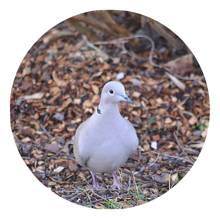 La Tourterelle turque (Streptopelia decaocto) : familière, elle a une silhouette typique, est d’un gris-beige clair, avec un fin demi-collier. Elle se nourrit de graines sur le sol ou sur les mangeoires (plateaux). Elle est plutôt méfiante et prompte à s’envoler.