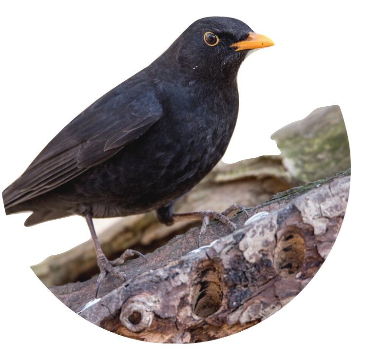Le Merle noir (Turdus merula) : le mâle est entièrement noir avec un bec jaune, la femelle et le jeune sont bruns avec un bec terne, mais tous ont la même corpulence et le même comportement. Cet oiseau apprécie les fruits (notamment les pommes), les miettes, les matières grasses et les déchets alimentaires disposés sur le sol à son attention.