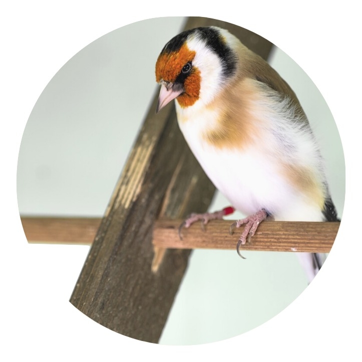 Le Chardonneret élégant : c'est un petit passereau, d'une taille inférieure à celle d'un moineau et facile à reconnaître. En effet, l'adulte a une face rouge sang et une grande zone jaune-citron sur l'aile. Il y a un léger dimorphisme sexuel qui, si l'on peut dire, ne saute pas aux yeux. Le mâle a le rouge de la face qui déborde l'œil vers l'arrière tandis que chez la femelle, le rouge s'arrête au niveau de l'œil. Le reste de la tête est noir et blanc. L'œil sombre est inclus dans une zone lorale noire. Le bec, régulièrement conique, est rose pâle.