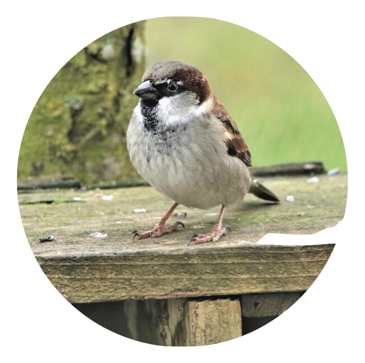 Le Moineau domestique (Passer domesticus) : c’est un passereau bien connu et familier. Il est globalement brun et gris, son bec est conique, et il est généralement vu en groupes. Le mâle est plus coloré que la femelle, avec du roux sur la calotte et le dos, tandis que la femelle est plus pâle, d’un beige uniforme.