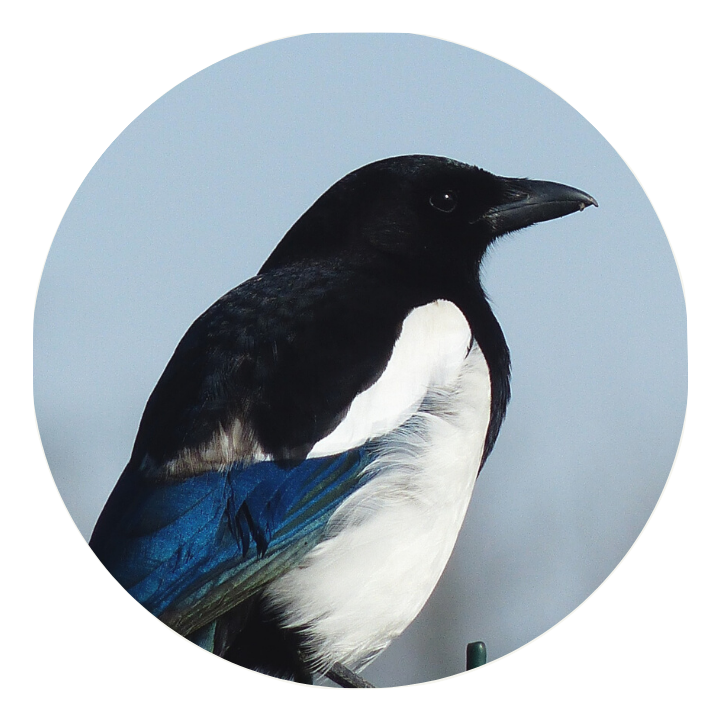 La Pie bavarde (Pica pica) : c’est un Corvidé de grande taille, noir et blanc, avec une longue queue, très facile à reconnaître. La pie est assez méfiante, mais elle sera attirée si vous mettez à sa disposition vos déchets alimentaires. Elle ne mange ni les fruits ni les graines.