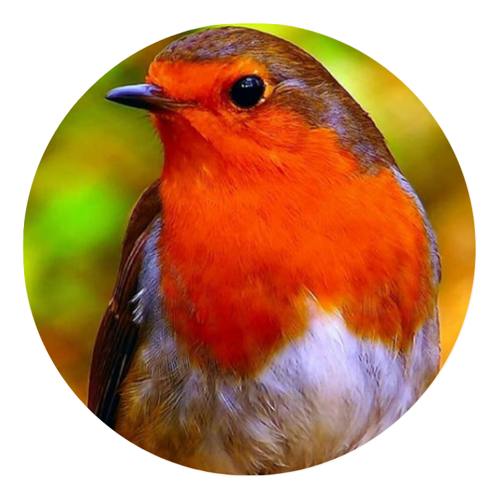 Le Rougegorge familier (Erithacus rubecula) : il est très facile à reconnaître avec son plastron orange, son dos marron clair et sa forme rondouillarde. Il est généralement vu seul, et il peut parfois s’approcher très près des maisons. Il ne mange pas de fruits ni de graines mais préfère les miettes, les matières grasses et les déchets alimentaires.