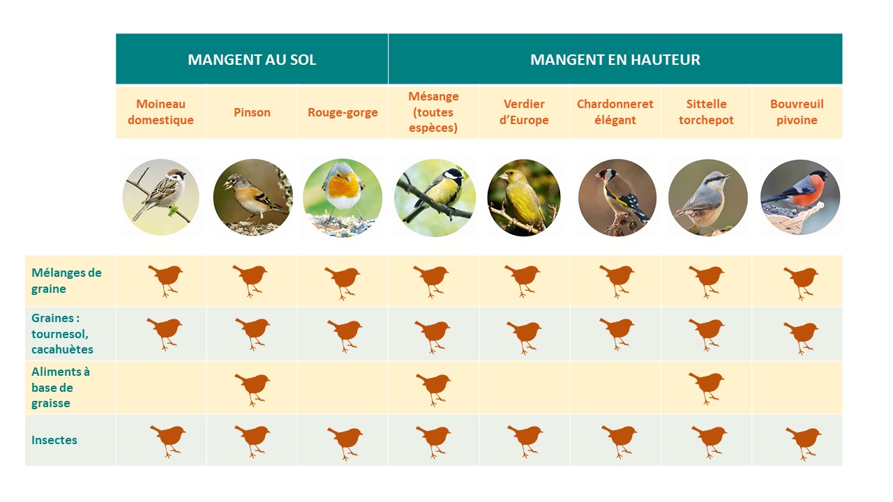 Les oiseaux insectivores (rouges gorges, troglodytes mignons...) se nourrissent d'insectes mais aussi de graines en hiver et les omnivores (mésanges, sittelles...) apprécient à la fois les graines, les insectes et également les aliments à base de graisse.