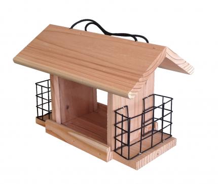 Mangeoire pour oiseaux en Pin Douglas, bois naturellement imputrescible. Sans traitement chimique. Haute résistance aux intempéries. Toit ouvrant. Remplissage aisé. Nettoyage facile. Larges avancées pour protéger la nourriture.