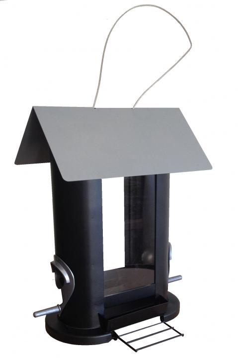 Mangeoire en métal et polycarbonate, à suspendre, munie de 4 perchoirs. Remplissage facile par le dessus.