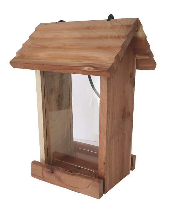 Mangeoire type silo à suspendre, en Red Cedar et plexiglas. Le Red Cedar, bois naturellement imputrescible, garantit une très bonne résistance en extérieur.
