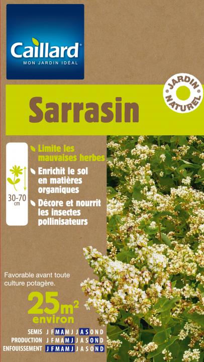 Cette Polygonacée annuelle à croissance rapide est rustique et d'installation rapide. Elle étouffe très bien les mauvaises herbes et aère le sol en profondeur grâce à son système racinaire développé. Idéal sur sol pauvre et acide, le Sarrasin prélève les phosphates du sol, non assimilés par les autres cultures. Hautement mellifère, il attire et abrite de nombreux insectes pollinisateurs et auxiliaires, alliés important dans la lutte contre les nuisibles. Sa destruction par le gel évite le fauchage avant l'enfouissement.